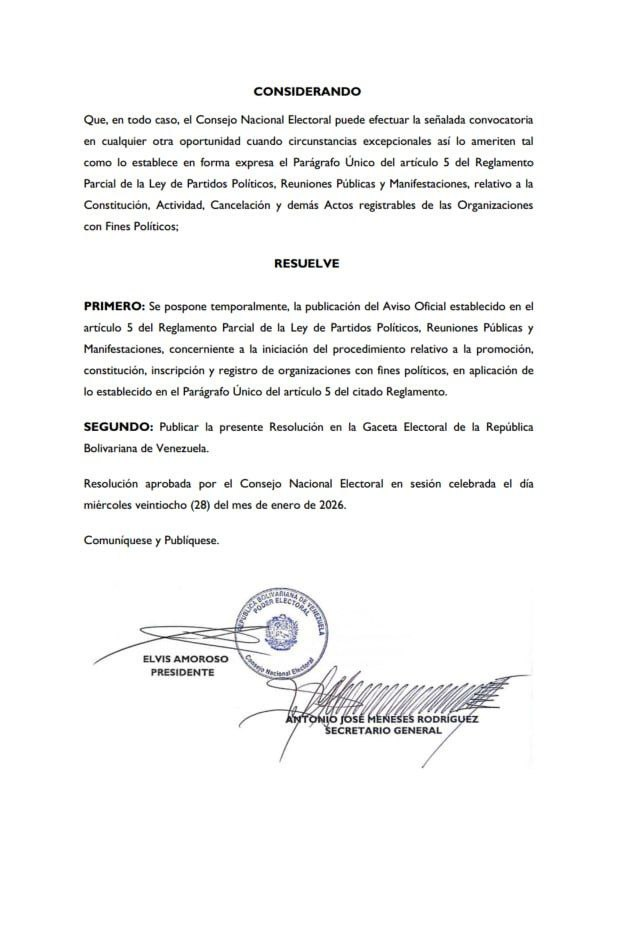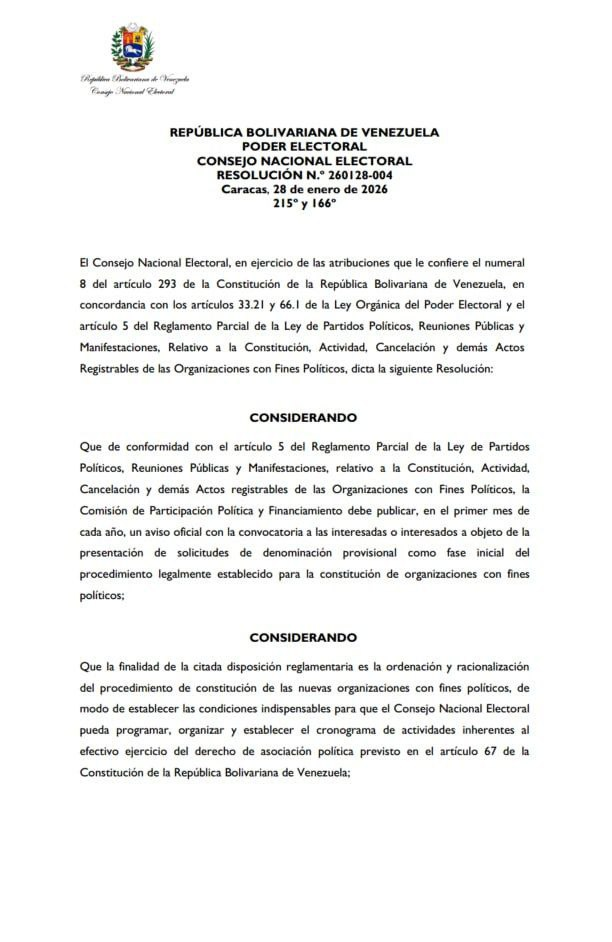 En la resolución publicada se establece que, de acuerdo con el Reglamento Parcial de la Ley de Partidos Políticos, el CNE debe convocar durante el primer mes de cada año a los ciudadanos interesados en presentar solicitudes de "denominación provisional", fase inicial para fundar un partido. Sin embargo, la normativa también prevé un Parágrafo Único en su artículo 5, que permite al ente electoral ajustar estos lapsos cuando existan circunstancias excepcionales que así lo ameriten.