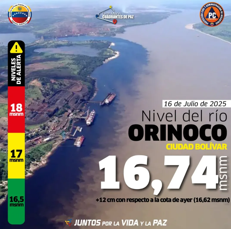 La Dirección Nacional de Protección Civil y Administración de Desastres informó este miércoles 16 de julio que se mantiene en alerta ante el aumento progresivo del nivel del río Orinoco en el estado Bolívar, luego de semanas de fuertes lluvias.