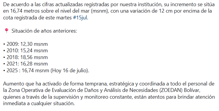 A través de su cuenta en Instagram, la institución detalló que el incremento del río se sitúa en 16,74 metros sobre el nivel del mar (msnm), con una variación de 12 centímetros, «por encima de la cota registrada de este martes 15 julio».