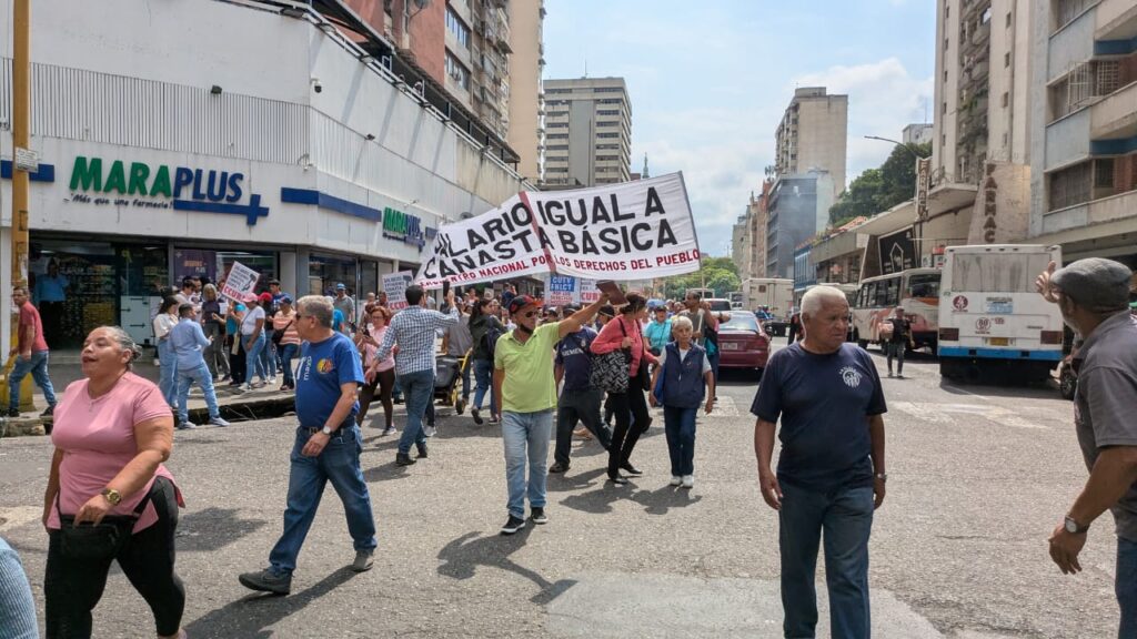 En Caracas, la marcha partió de la plaza Morelos, en el municipio Libertador, y avanzó hacia la Asamblea Nacional. Los manifestantes reclaman un aumento inmediato del salario mínimo y de las pensiones, congelados desde hace cuatro años en 130 bolívares, una cifra que apenas supera los 30 centavos de dólar.