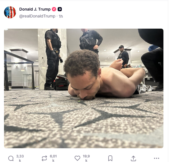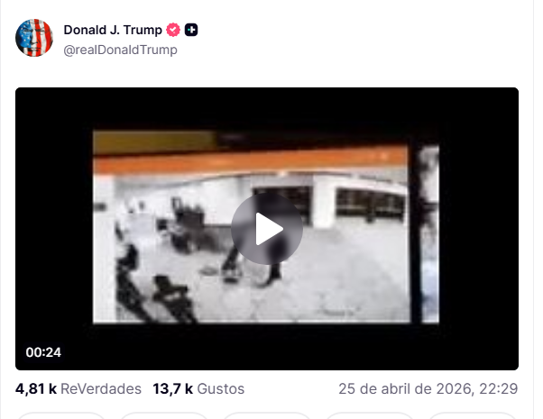 Los mensajes publicados por el mandatario carecen de texto adjunto y se limitan a la difusión de material visual sobre el incidente protagonizado por un hombre de 31 años, originario de California, cuya identidad no ha sido revelada oficialmente en este contexto.