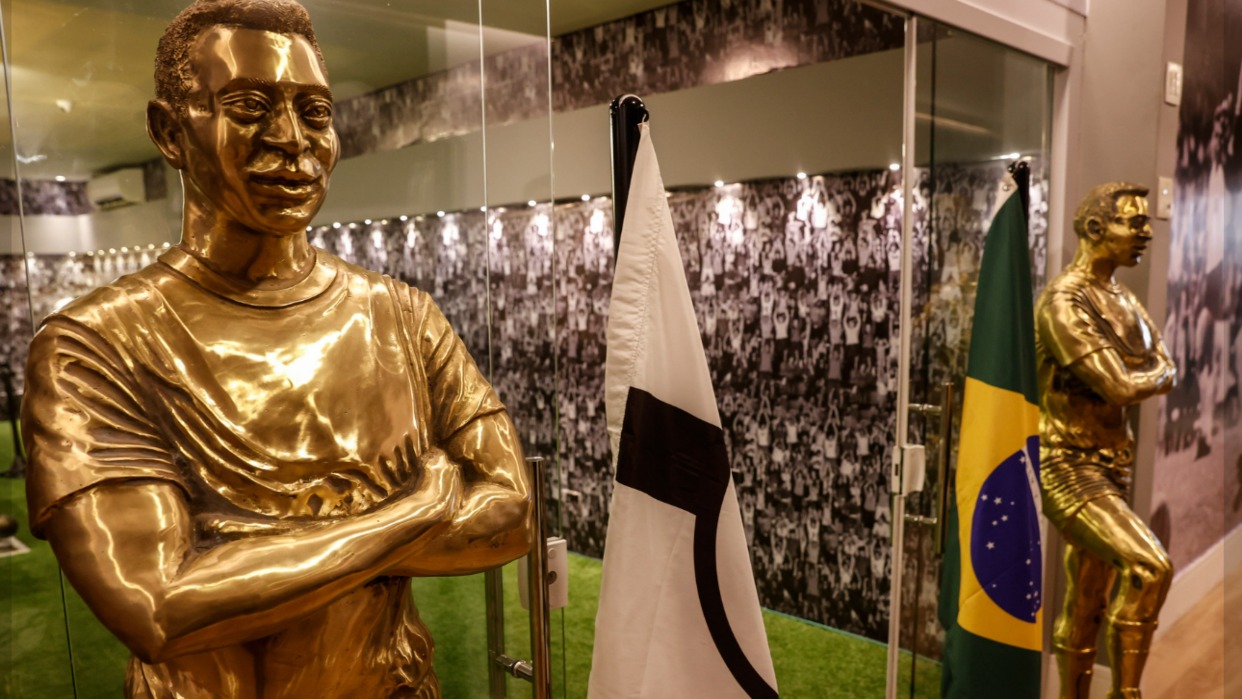 El triple campeón mundial reposa en una sala que respira fútbol por los cuatro costados. A la entrada, dos estatuas de latón de la figura de un Pelé vestido de corto y sonriendo anticipan la majestuosidad del lugar.